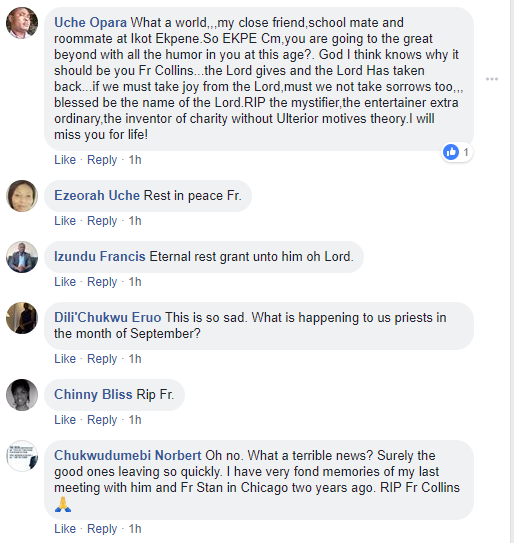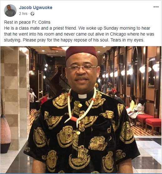 According to Jacob Ugwuoke, a friend and classmate of the late priest, Father Collins died after he went into his room in Chicago to study and never came out alive.