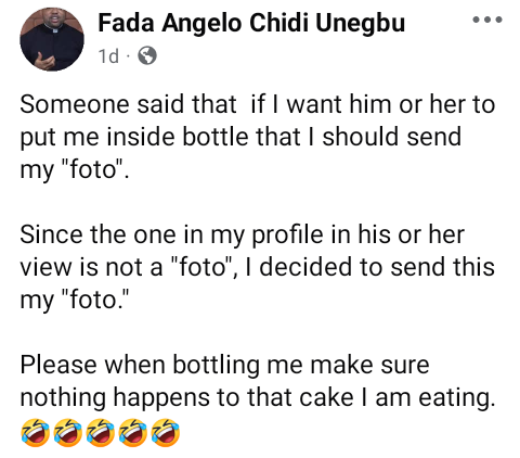“Someone said that if I want him or her to put me inside bottle that I should send my “foto”. Since the one in my profile in his or her view is not a “foto”, I decided to send this my “foto.” Please when bottling me make sure nothing happens to that cake I am eating,” he wrote.