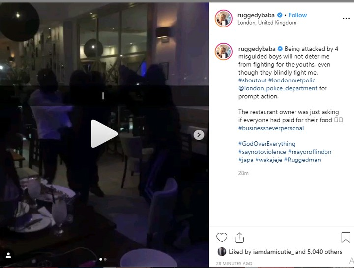 Some Nigerian celebrities have reacted, after Ruggedman was attacked last night in London, shortly after Naira Marley was released from Ikoyi Prison yesterday in Lagos. Ruggedman who shared a video at the restaurant where he was attacked in London, stated that being attacked by 4 misguided boys will not deter him from fighting for the youths. He wrote as he shared a video from the scene of the incident;