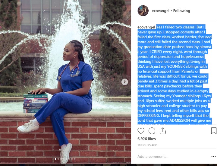 Yes I️ failed two classes! But I️ never gave up. I️ stopped comedy after I️ failed the first class, worked harder, focused more and still failed the second class, I had my graduation date pushed back by almost a year. I️ CRIED every night, went through period of depression and hopelessness thinking I️ have lost everything. Living in USA with just my YOUNGER siblings with no financial support from Parents or relatives, life was difficult for us, we could barely eat 3 times a day, had a lot of past due bills, spent paychecks before they arrived and some days studied in a empty stomach.