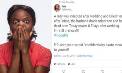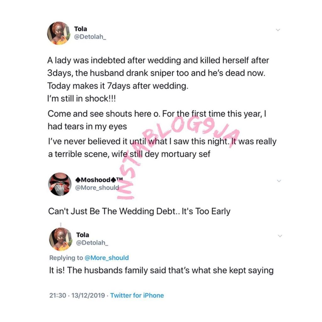 “A lady was indebted after wedding and killed herself after 3 days, the husband drank sniper too and he’s dead now. Today makes it 7 days after wedding. I’m still in shock!!! Come and see shouts here o. For the first time this year, I had tears in my eyes I’ve never believed it until what I saw this night. It was really a terrible scene, wife still dey mortuary sef” she tweeted. However, after a Twitter user suggested that it might not be the wedding debt that pushed the couple to commit suicide, Tola further wrote: “It is! The husband’s family said that’s what she kept saying” See post below: