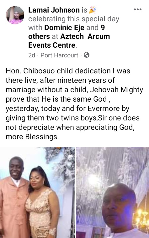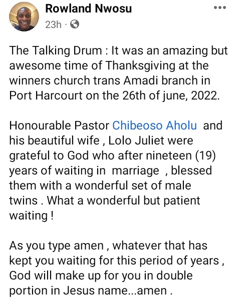 “Honourable Pastor Chibeoso Aholu and his beautiful wife , Lolo Juliet were grateful to God who after nineteen (19) years of waiting in marriage , blessed them with a wonderful set of male twins,” he wrote.