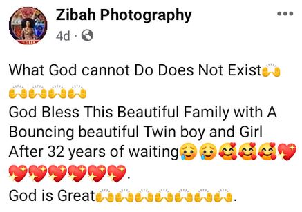“What God cannot Do Does Not Exist. God Bless This Beautiful Family with A Bouncing beautiful Twin boy and Girl. After 32 years of waiting. God is Great,” the post read.