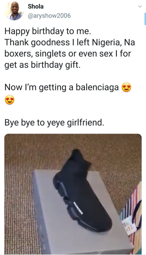 A Nigerian medical doctor resident in the United Kingdom took to Twitter to express his happiness for leaving Nigeria and Nigerian women after he got a Balenciaga footwear as a birthday gift from a woman in the UK, IgbereTV reports.
