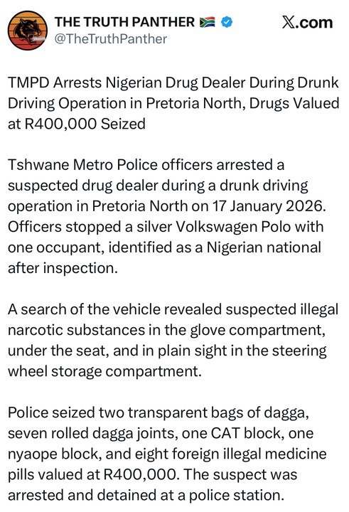 Tshwane Metro Police officers arrested a suspected drug dealer during a drunk driving operation in Pretoria North on 17 January 2026. Officers stopped a silver Volkswagen Polo with one occupant, identified as a Nigerian national after inspection.