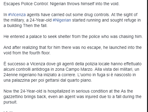 A 24-year-old Nigerian migrant is said to be in critical condition after he jumped from the fourth floor of a building during police chase in Vicenza, Italy.