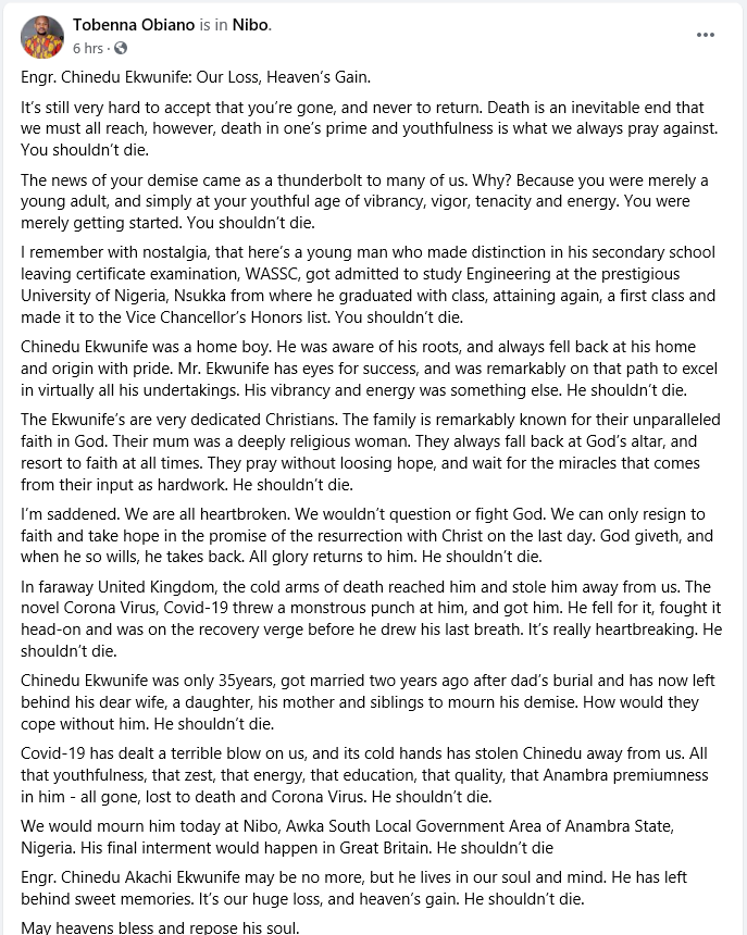 A young Nigerian Engineer; Mr Chinedu Ekwunife, a native of Nibo in Anambra state has just passed on after battling with the novel covid-19 virus in the UK.