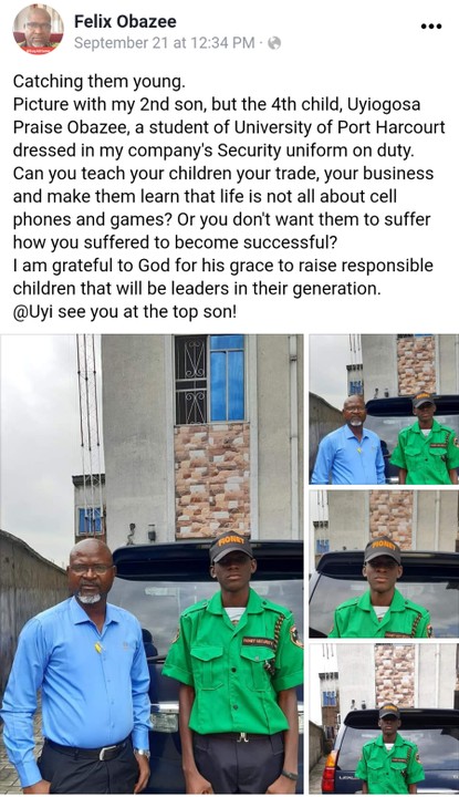 Obazee, who is the CEO of Fionet Security Services, made this known via a LinkedIn post. He shared photos of his child dressed in the company’s security uniform and said that he did it in order to give his son quality parenting.