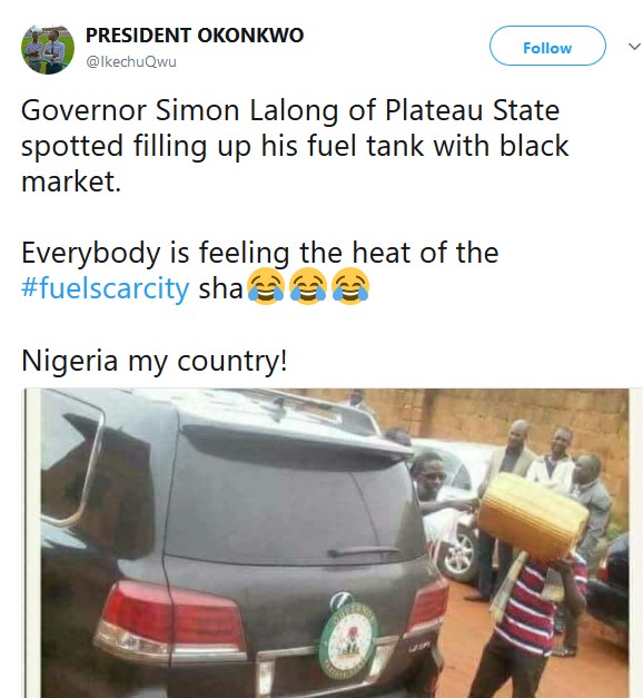 As fuel scarcity bites harder in Nigeria, A Nigerian governor, Simon Lalong of Plateau state was yesterday spotted filling up his tank with a black market dealer.
