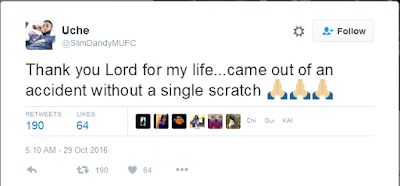 Nigerian computer programmer resident in Lagos was involved in a near fatal accident that left the front part of his car a crumpled mass of metal. Uche, who goes by the Twitter name @SlimDandyMUFC posted photos from the scene, yesterday, thanking God for saving his life.