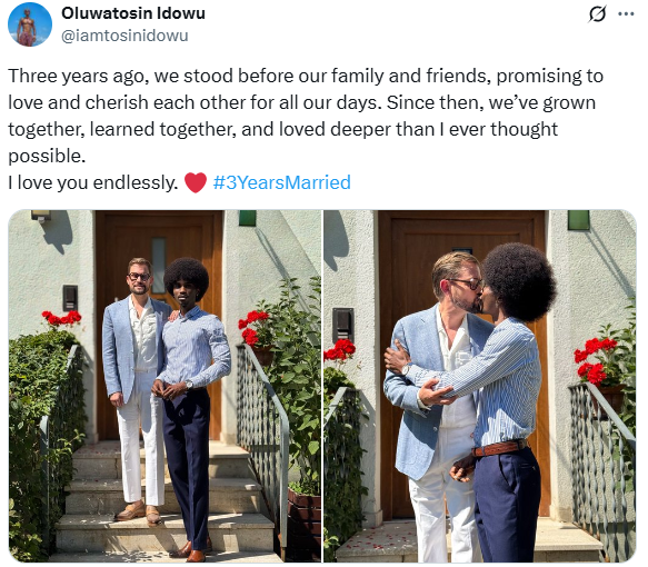 Nigerian hairstylist, Tosin Idowu is celebrating his third wedding anniversary with his German husband.