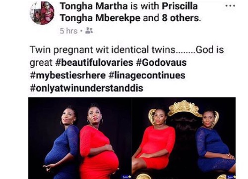 Nigerian identical twins identified as Tongha Martha and Priscilla Tongha Mberekpe, who are pregnant with identical twins have shared their maternity photos.