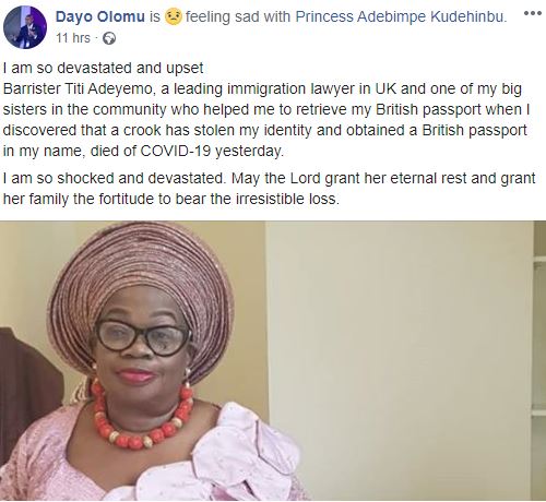 “Barrister Titi Adeyemo, a leading immigration lawyer in UK and one of my big sisters in the community who helped me to retrieve my British passport when I discovered that a crook has stolen my identity and obtained a British passport in my name, died of COVID-19 yesterday.