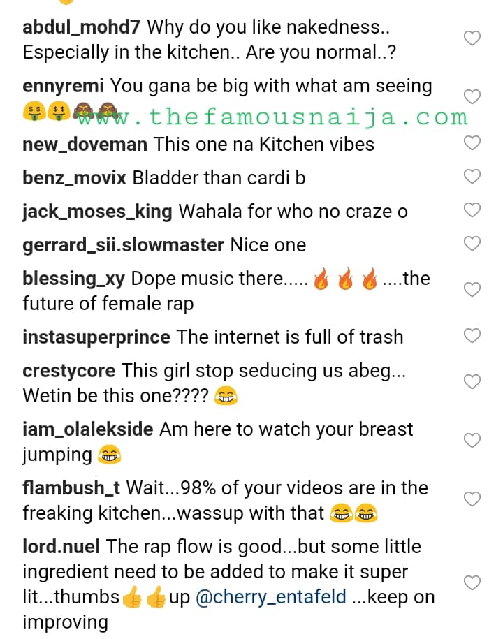 A beautiful Nigerian rapper has come under severe criticisms for singing and promoting her new song ‘Main Chick’ wearing just pant and bra in the kitchen.