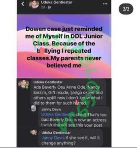 Nigerian actress, Beverly Osu has been called out on Facebook by a lady identified as Udoka Gentlestar, for allegedly bullying her during her school days.