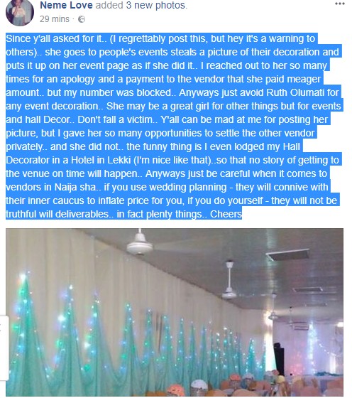 A Nigerian man and Facebook user, Neme Love, took to the platform to call out an event decorator whose name he gave as Ruth Olumati, for reportedly stealing photos online and paying meager amount to vendors.