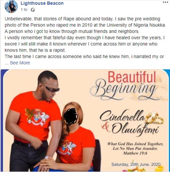 Beacon wrote; Unbelievable, that stories of R*pe abound and today, I saw the pre wedding photo of the Person who raped me in 2010 at the University of Nigeria Nsukka.