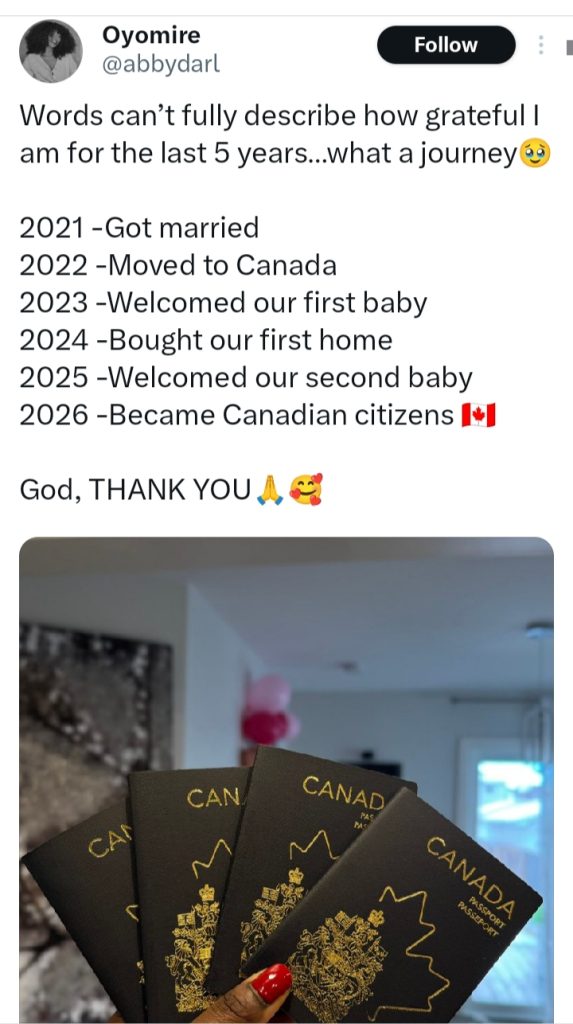In the years that followed, she welcomed her first child in 2023, purchased her first home in 2024, and had her second baby in 2025. In 2026, she and her family achieved another major milestone by becoming Canadian citizens.