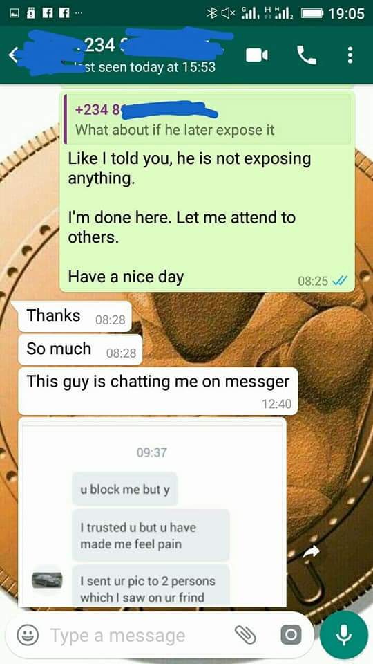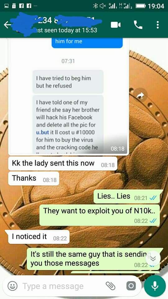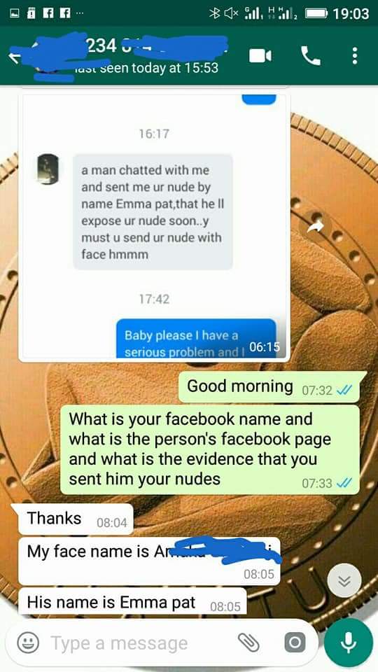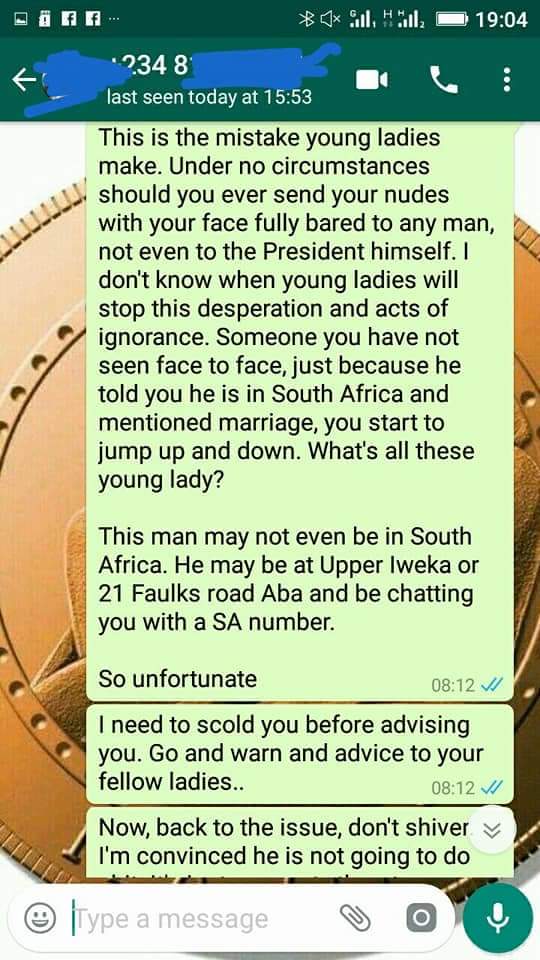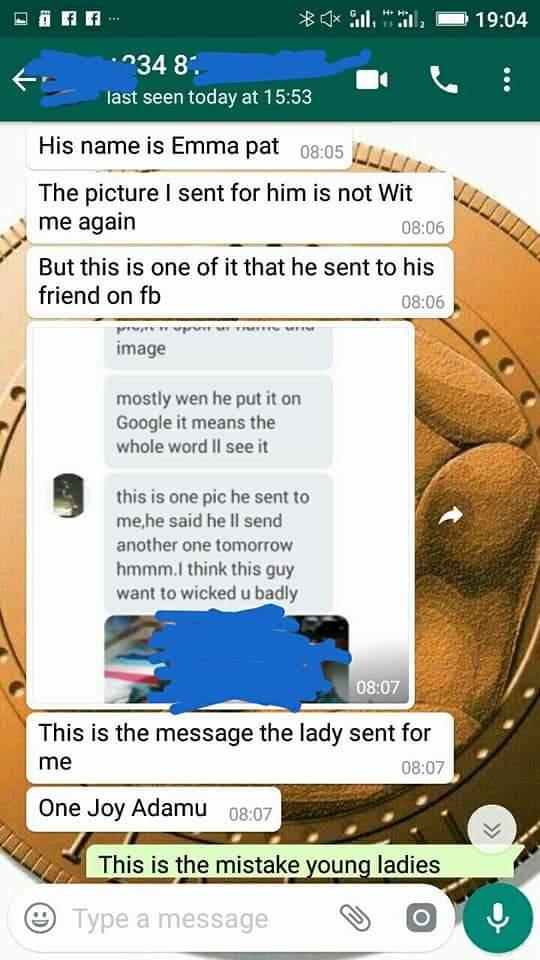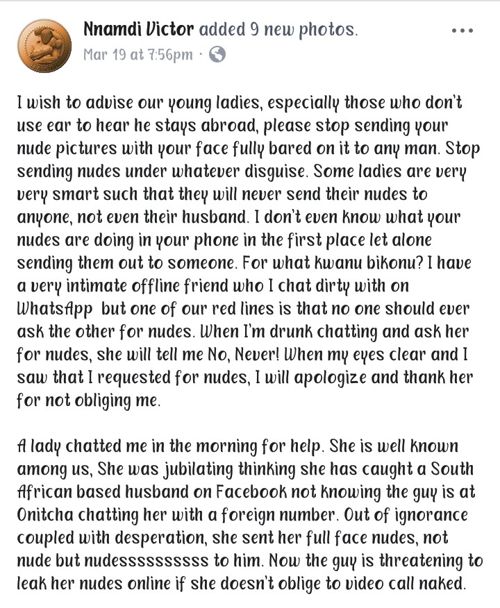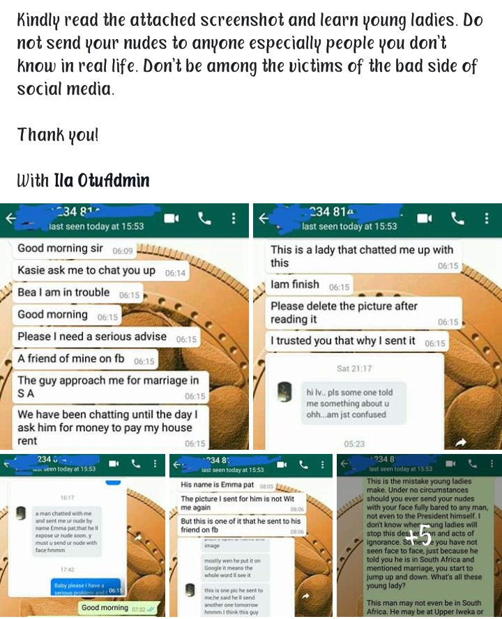 Kindly read the attached screenshot and learn young ladies. Do not send your nudes to anyone especially people you don’t know in real life. Don’t be among the victims of the bad side of social media.