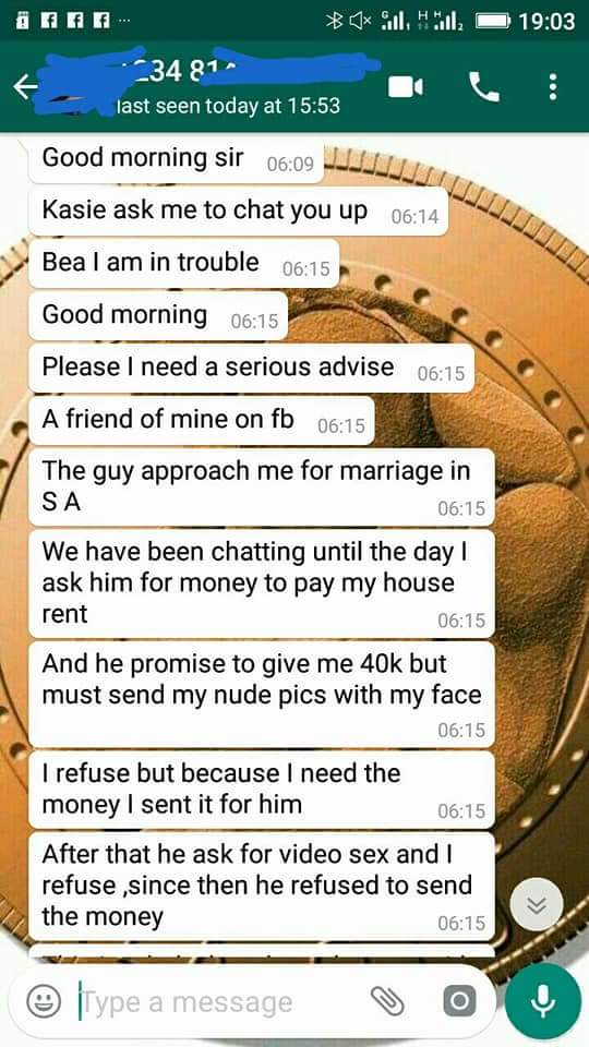 According to the lady, the man is requesting her to do a nude video and send it to him or else he will release her nude photos he has with him.