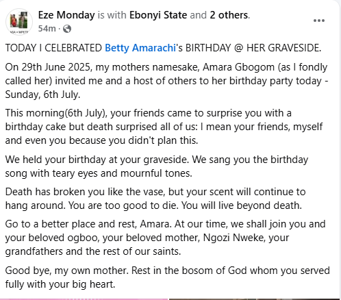 “TODAY I CELEBRATED Betty Amarachi‘s BIRTHDAY @ HER GRAVESIDE. On 29th June 2025, my mothers namesake, Amara Gbogom (as I fondly called her) invited me and a host of others to her birthday party today – Sunday, 6th July,” he wrote.