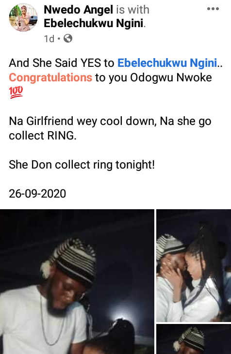 A young man identified as Ebelechukwu Ngini from Anambra State ahs asked his girlfriend to marry him and she knelt down to accept his ring.
