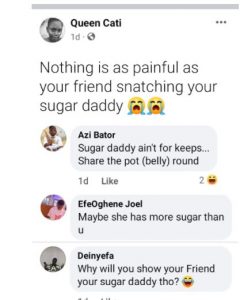 “A Nigerian lady identified as Queen Cati on Facebook took to the platform to express sadness after her friend allegedly snatched her sugar daddy.