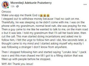 The Facebook user further revealed that she stopped following him and started saying “Loruko Jesu”, before fleeing from him. She concluded by disclosing that the man chased after her, but stopped after she got to a filling station where people were.
