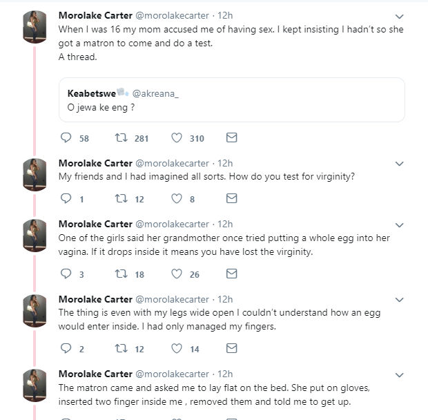 A Nigerian lady in shocking tweets, narrated how she gave up her virginity after her mum forced her to undergo virginity test. According to the Twitter user @morolakecarter, her mum forced her to undergo virginity test after she insisted she wasn’t having sex. She further disclosed that she lost it following the accusation. The Nigerian lady who narrated how she gave up her virginity further disclosed that now at 25, she is now accused of sleeping with people’s dad.