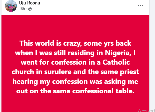 “This world is crazy, some yrs back when I was still residing in Nigeria, I went for confession in a Catholic church in surulere and the same priest hearing my confession was asking me out on the same confessional table.”