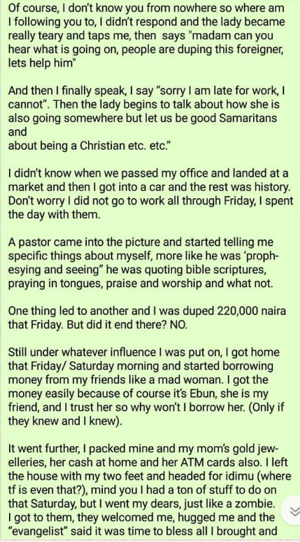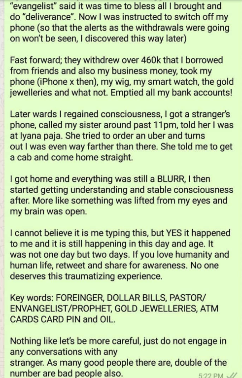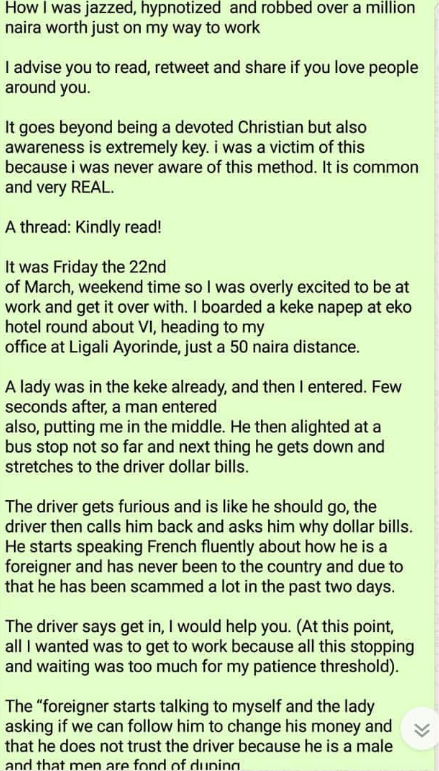 Nigerian Lady Recounts How She Was Hypnotised And Duped Of N1 Million In Lagos