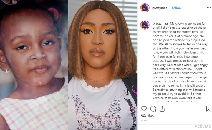 “My growing up wasnt fun at all. I didn’t get to experience those sweet childhood memories because i became an adult at a minor age. No one helped me retrace my steps,God did. We all hv stories to tell in one way or the other. How you make your bed is how you will definitely sleep on it. All these pain formed into anger because i was forced to heal up the hard way.