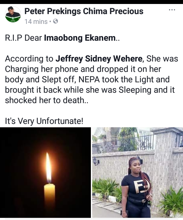 According to Jeffrey Sidney Wehere, She was Charging her phone and dropped it on her body and Slept off, NEPA took the Light and brought it back while she was Sleeping and it shocked her to death..