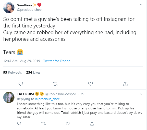 Meeting people off social media has its negative sides and a Nigerian Twitter user @precious_chee, has taken to the platform to share one which involved a friend that got robbed by a guy she met on Instagram.