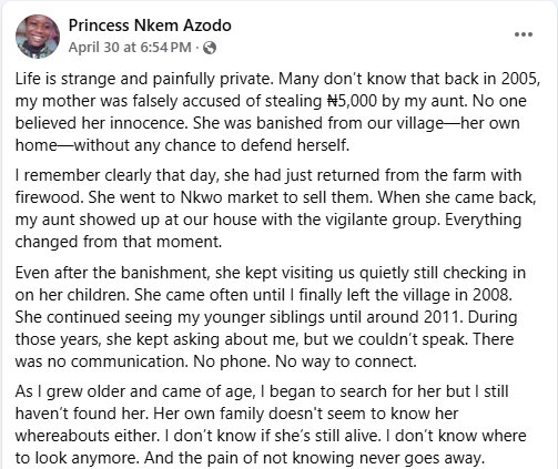 Nkem, who disclosed this in a Facebook post on April 30, 2025, said that her mother visited them secretly after the banishment.