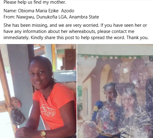 A Nigerian lady, Princess Nkem Azodo, has embarked on a search for her mother, Obioma Maria Ezike Azodo, who was banished from their village, Nawgwu in Dunukofia Local Government Area of Anambra State, 20 years ago after being accused of stealing N5,000 by her aunt.