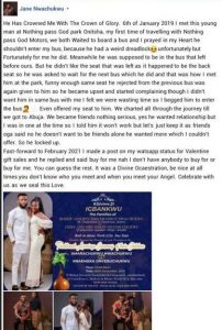 “He Has Crowned Me With The Crown of Glory. 6th of January 2019 I met this young man at Nothing Pass God park, Onitsha, my first time of travelling with Nothing Pass God Motors, we both Waited to board a bus and I prayed in my Heart he shouldn’t enter my bus, because he had a weird dreadlock unfortunately but Fortunately for me he did.