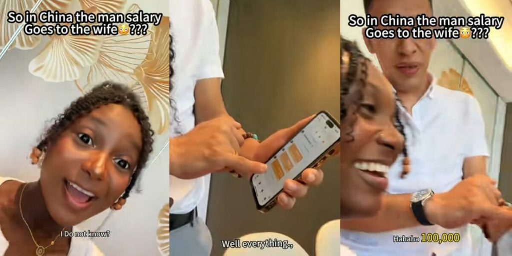A Nigerian lady has expressed shock over a cultural practice she discovered during a visit to China—men‘s salaries being paid directly into their wives‘ bank accounts.