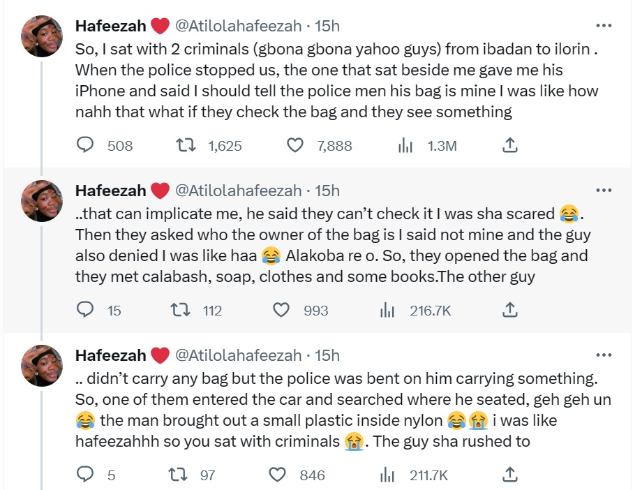 “So, I sat with 2 criminals (gbona gbona yahoo guys) from ibadan to ilorin . When the police stopped us, the one that sat beside me gave me his iPhone and said I should tell the police men his bag is mine I was like how nahh that what if they check the bag and they see something that can implicate me, he said they can’t check it I was sha scared.