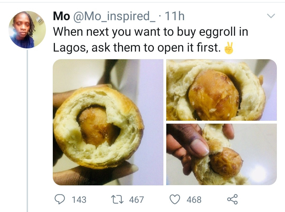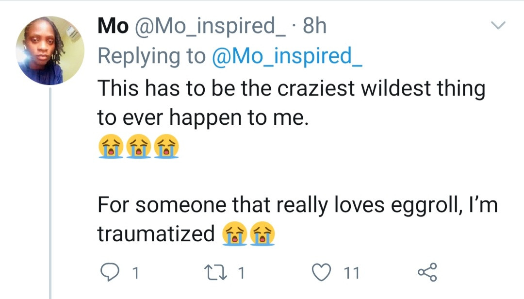 Rather than a boiled egg, the woman found puff-puff inside her eggroll. She said for someone who loves eggroll, the incident left her traumatized.