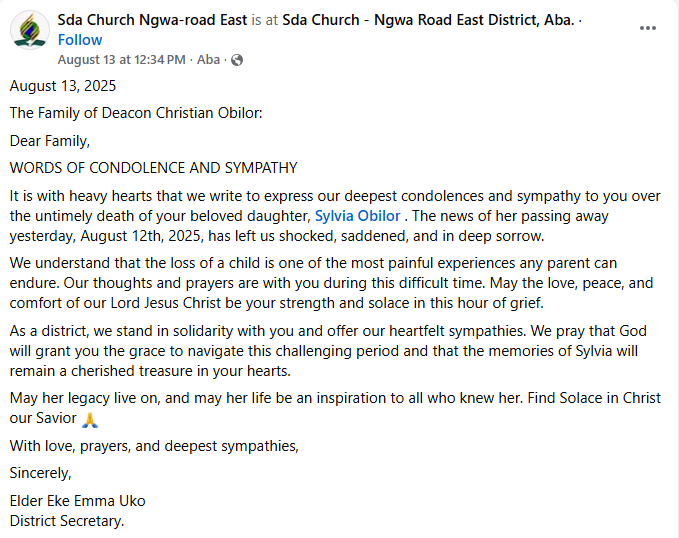 “The Family of Deacon Christian Obilor: Dear Family, WORDS OF CONDOLENCE AND SYMPATHY. It is with heavy hearts that we write to express our deepest condolences and sympathy to you over the untimely d3ath of your beloved daughter, Sylvia Obilor. The news of her passing away yesterday, August 12th, 2025, has left us shocked, saddened, and in deep sorrow,” the statement read.
