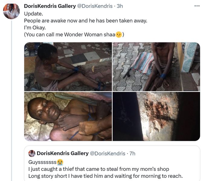 A brave Nigerian lady identified as Doris Kendris on Twitter has shared photos of an alleged thief who she claims came to steal from her mum’s shop in Ebonyi state.