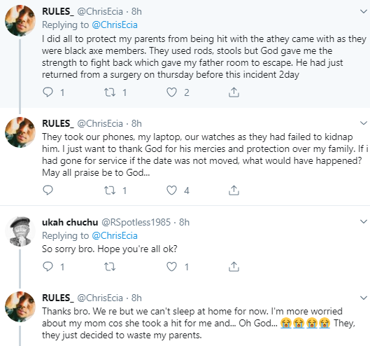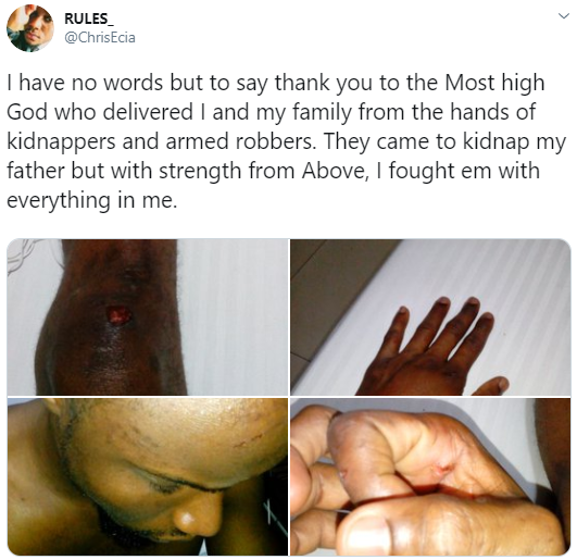 The lawyer with the handle @ChrisEcia on Twitter, said the men who he believes are cultists, came with the sole purpose of kidnapping his father but he was able to fight them off .