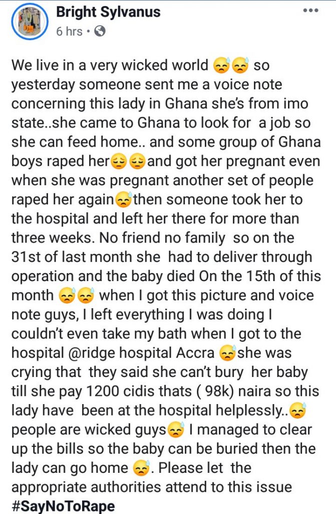 We live in a very wicked world. so yesterday someone sent me a voice note concerning this lady in Ghana she’s from imo state..she came to Ghana to look for a job so she can feed home.. and some group of Ghana boys raped her and got her pregnant even when she was pregnant another set of people raped her again then someone took her to the hospital and left her there for more than three weeks. No friend no family so on the 31st of last month she had to deliver through operation and the baby died On the 15th of this month. when I got this picture and voice note guys, I left everything I was doing I couldn’t even take my bath when I got to the hospital @ridge hospital Accra she was crying that they said she can’t bury her baby till she pay 1200 cidis thats ( 98k) naira so this lady have been at the hospital helplessly.. people are wicked guys. I managed to clear up the bills so the baby can be buried then the lady can go home. Please let the appropriate authorities attend to this issue #SayNoToRape.