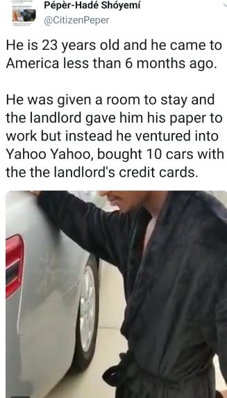 Twitter user, @Citizenpeper said he however allegedly “ventured into Yahoo Yahoo” and used money from his benefactor’s account to buy cars.