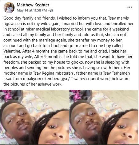 “Good day family and friends, I wished to inform you that, Tsav marvis nguwasen is not my wife again, I married her with love and enrolled her in school at mkar medical laboratory school, she came for a weekend and called all my family and her family and told us that, she can not continued with the marriage again, she transfer my money to her account and go back to school and got married to one boy called Valentine, After 4 months she came back to me and cried, I take her back as my wife, After 9 months she told me that, she want to have her freedom, she packed to my house to gboko, now she is sleeping with peoples and sending me the pictures she is having sex with them, Her mother name is Tsav Regina mbateren , father name is Tsav Terhemen Issac from mbakyom ukemberagya / Tswarev council word, below are the pictures of her asawe work,” he wrote.
