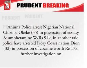 Anjuna police also arrested an Ivory Coast national identified as Dion Albert,31, for possession of narcotic drugs suspected to be Cocaine worth Rs 17,000.