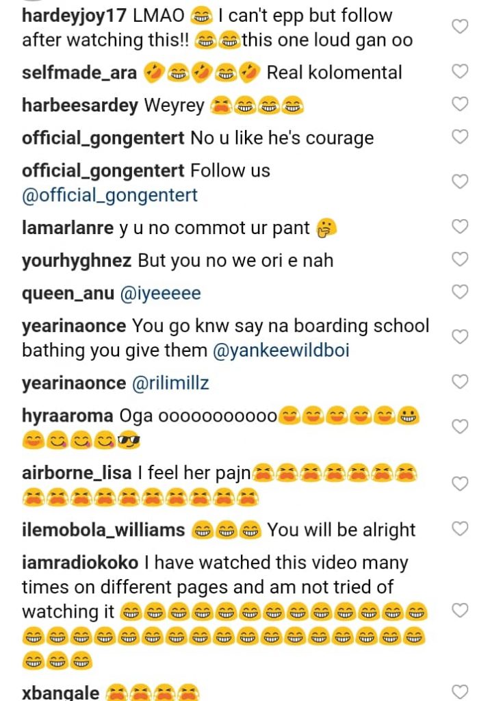 He told the white lady that witches and wizards from his village want to attack him so he had to bath publicly on the road as “Kolomental” by Fazealone played in the background.
