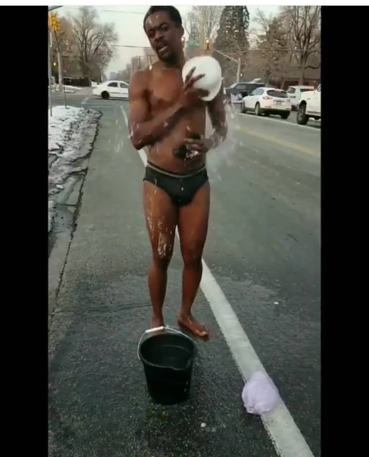 Nigerian Man Bathes On The Main Road In US To Mark Birthday, Shocks Oyinbo Lady (Photos)