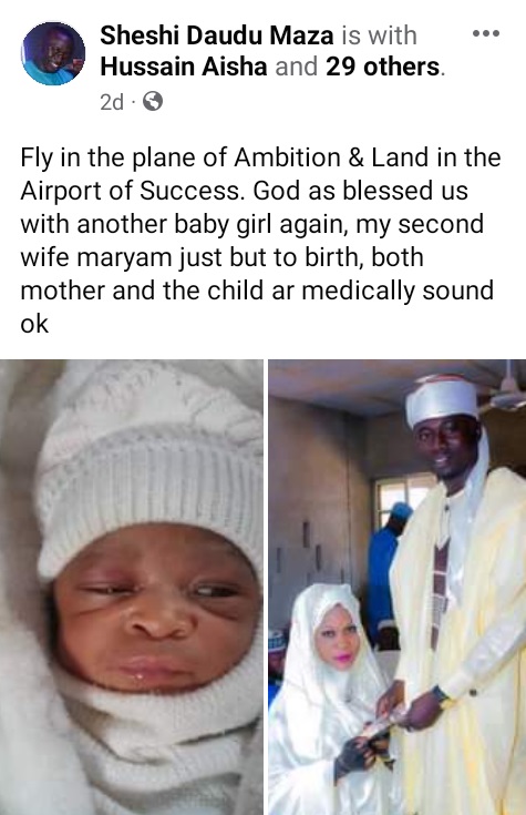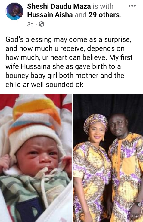 “God’s blessing may come as a surprise, and how much u receive, depends on how much ur heart can believe. My first wife Hussaina, she as gave birth to a bouncing baby girl both mother and the child are well sounded ok,” he wrote.